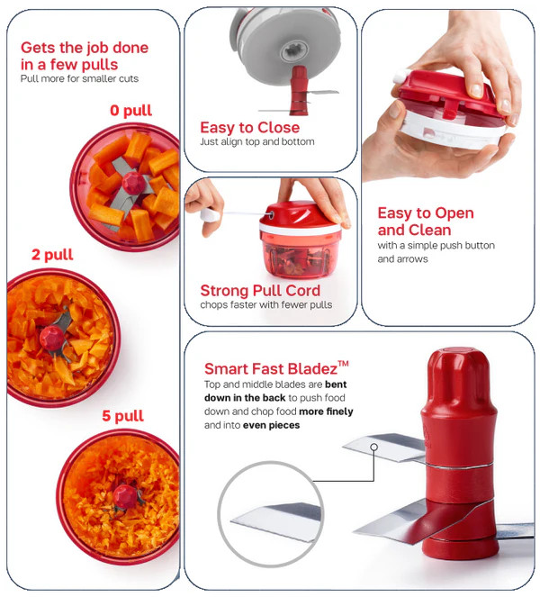 • Ezzel pofonegyszerű az aprítás: csak párszor meghúzod a zsínórt és kész!